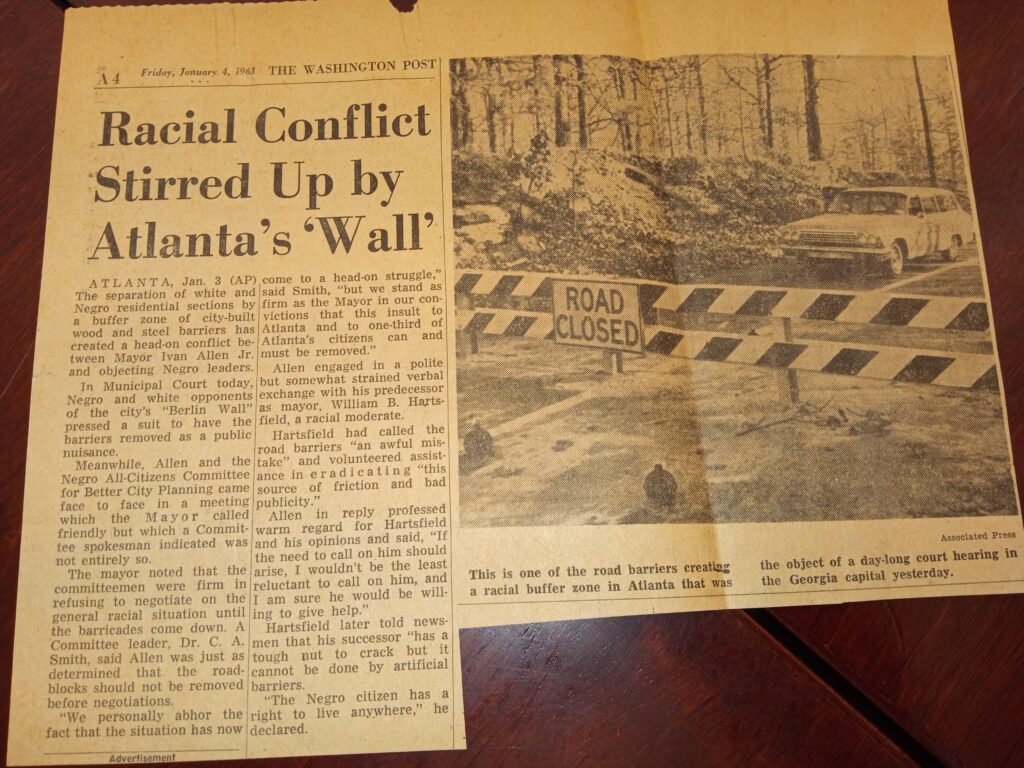 Although the wall was the brainchild of white homeowners in the neighborhood¹⁰, and Mayor Allen had the support of city officials and a judge who initially upheld the wall as legal, the response and opposition to the wall was quick, multi-racial, intense¹², intergenerational, and came from as far as New York¹³.  Three white residents who lived in the community of focus partnered with two Black residents who lived in an adjacent community to hire Civil Rights attorney Donald Lee Hollowell to file a lawsuit to remove the barrier. College students led protests at white businesses, there were demonstrations at the sites of the blockades, and people wrote to Mayor Allen to voice their disapproval, disappointment, and to encourage him to remove the Atlanta Wall. Less than four months after the wall was established, a superior court judge determined that the wall was unconstitutional, and it was removed in early March.